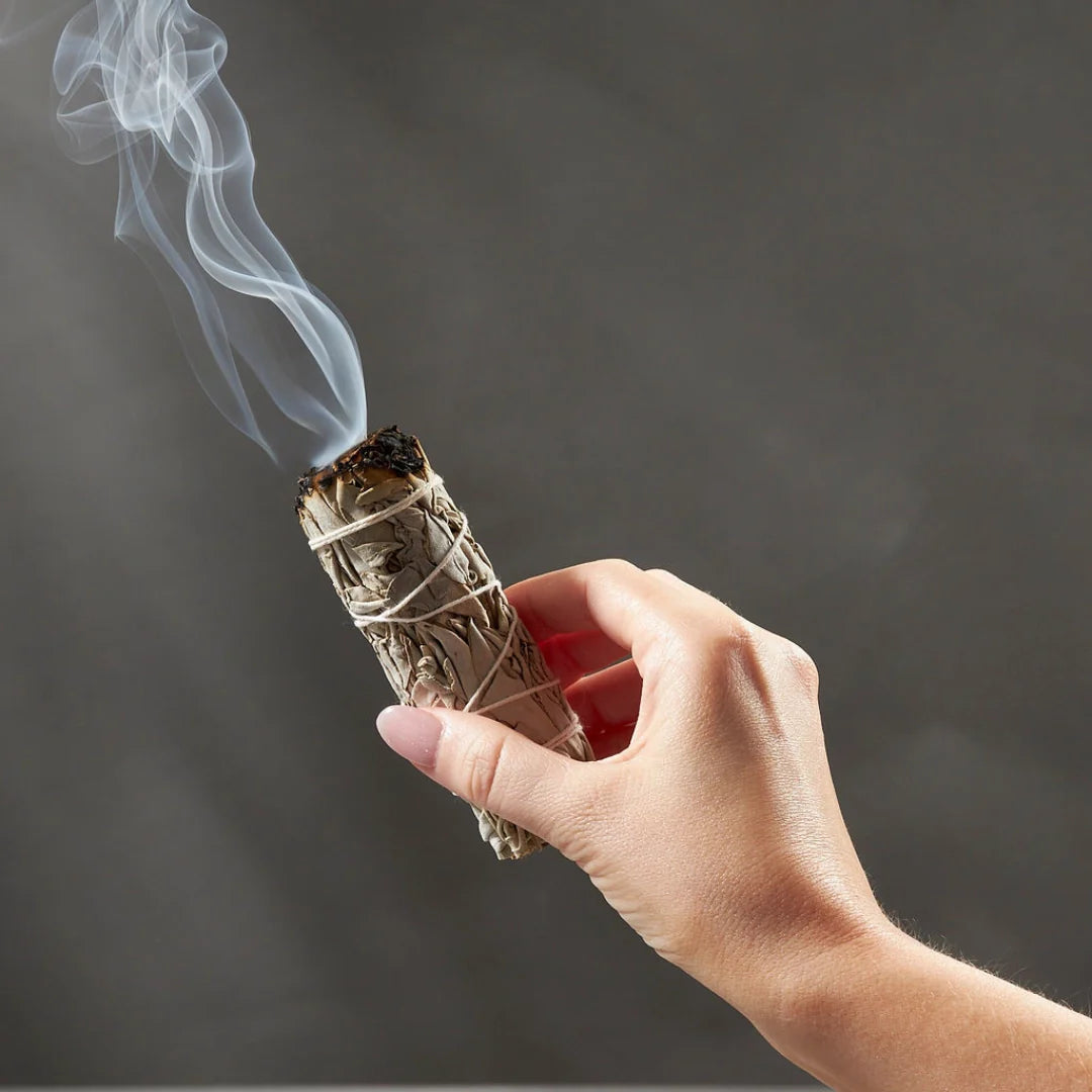 - Burn the sage bundle from onside using a lighter or candle. Once it catches fire and starts giving out smoke then smudge the entire premises, your crystals as well as your aura with it.